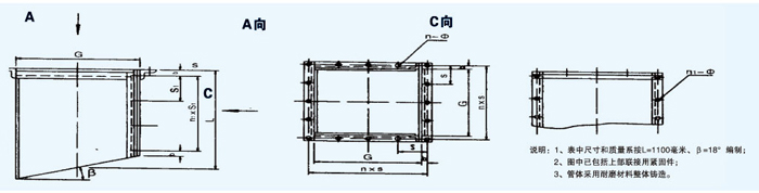 說明:1、表中尺寸和質(zhì)量系按L=1100毫米、β=18°編制;2、圖中已包括上部聯(lián)接用緊固件;3、管體采用耐磨材料整體鑄造。